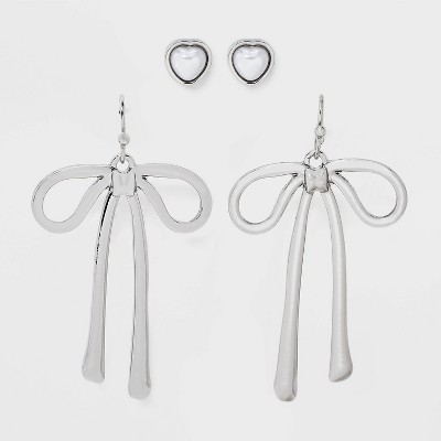 Pearl Heart and Bow Drop Earring Set 2pc - Wild Fable™ Silver