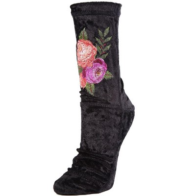Memoi Floral Embroidered Crushed Velvet Socks