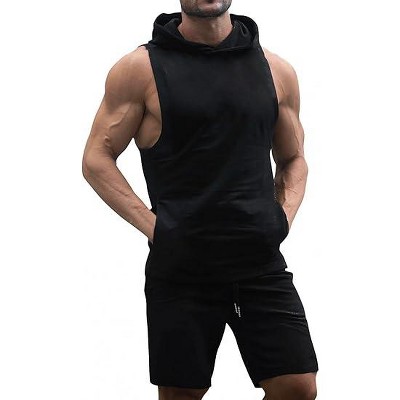 Men's Tracksuit 2 Piece Sleeveless Hooded Workout Tank Top and Shorts Casual Athletic Sports Hoodie Shorts Set