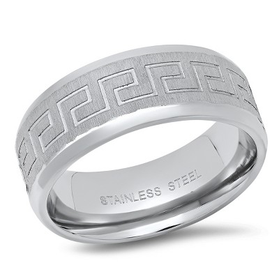 Steeltime Men's stainless steel brushed band ring with greek key accents