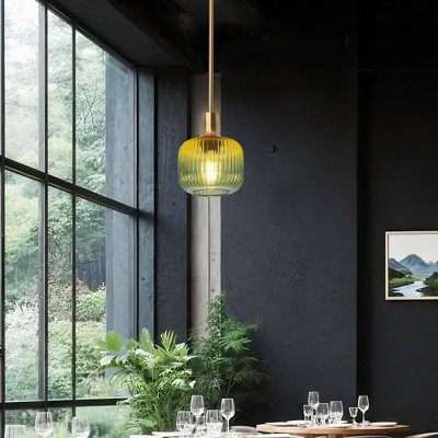 Dewdrop Modern Cylinder Pendant Light, White Fabric Shade with Gold Trim Hanging Ceiling Fixture for Dining Room Kitchen