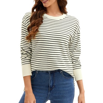 INSPIRE CHIC Women Striped Long Sleeve Drop Shoulder Curved Hem Pullover Top Sweater