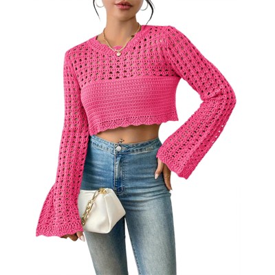 Coolmee Womens Sweaters for Fall Fashion Crewneck Casual Long Sleeve Crochet Hollow Knit Pullover