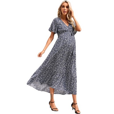 Womens Maternity Dress Ruffled Shirred Dress Floral Sundress with Flutter Cap Sleeve V Neck Flowy Midi Dress Flowy Gathered Hem Dress