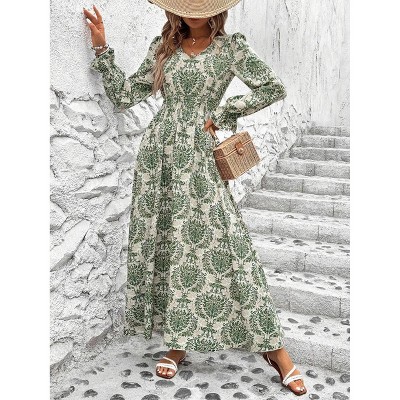 Women Floral Print V Neck A-Line Maxi Dress Long Sleeves Casual Wrap Autumn Beach Swing