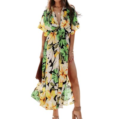 Women's Boho Floral Print Square Neck Beach Party Flowy Ruffle Maxi Dress