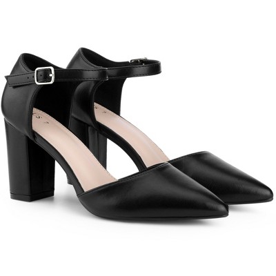BLISSFUL STEP Women's Ankle Strap Pointy Toe Chunky Heel Pumps