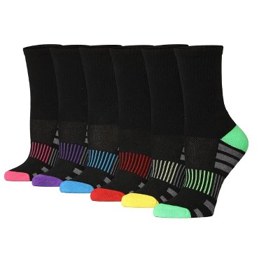 Tipi Toe Women's 6 Pack Black/Bright Toe Color Patterned Athletic Hiking Arch Support Crew Socks