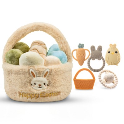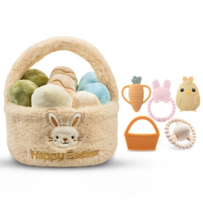 Easter Plush Bunny with Carrot & Easter Egg Plush Basket Toy Set, Cute Easter Stuffed Plush Bunny & Easter Basket Plush with Eggs, Easter Toy Gift Set