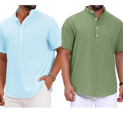 INSPIRE CHIC Men's Henley Solid Color Stand Collar Short Sleeve Linen Shirt 2 Packs
