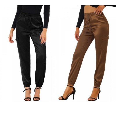 Allegra K Women's Drawstring Elastic High Waist Cargo Pocket Silky Satin Pants 2 Packs