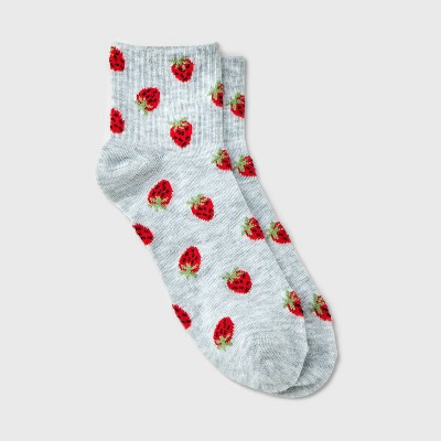 Women's Strawberries Ribbed Ankle Socks - Heather Gray/Red 4-10: Lightweight, Banded Cuff, Recycled Polyester