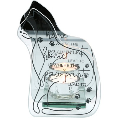 Pavilion Gift Company - Home Is Where The Pawprints Lead To - 4.5" x 6" x 2.25" Cat Tealight Candle Glass And Mirror Holder - Cat Mom Cat Dad Gift