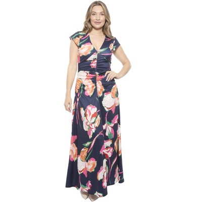 Womens Floral V-Neck Cap Sleeve Ruched Front Maxi Length Dress - 24seven Comfort Apparel™