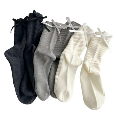 Anna-Kaci Women's 3-Pair Ribbed Crew Socks with Satin Bow Tie Cuffs Soft Stretch Everyday Socks - Black+Gray+Beige