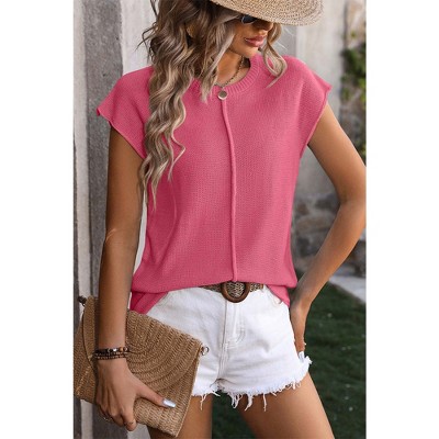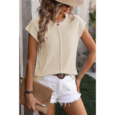 Attraco Women's Cap Sleeve Textured Center-Seam Crew Neck Blouse Spring Summer Tops