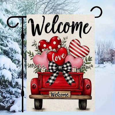Valentine's Day Single-Sided Garden Flag | Love Hearts Truck Rustic Farmhouse Yard Holiday & Anniversary Decor 12x18in