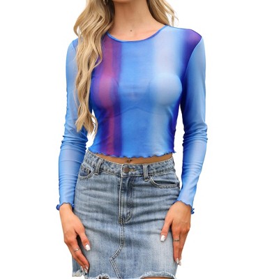 INSPIRE CHIC Women's Summer Causal Mesh Long Sleeve Crew Neck Wave Hem Party Crop Tops