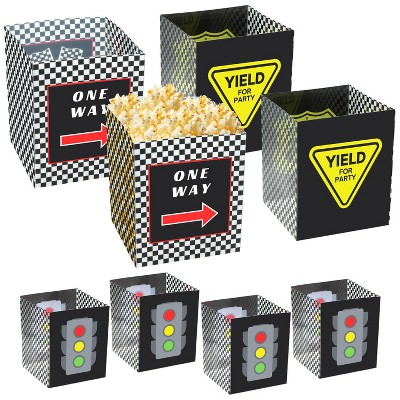 4E's Novelty 8 Pack Racing Theme Bucket Centerpiece – Race Car Birthday Party Decorations, Popcorn Treat Boxes, Checkered Box Snack Holders for Kids