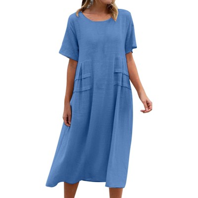 INSPIRE CHIC Women's 3/4 Sleeve Pleated Round Neck Pockets A-Line Swing Work Midi Dress