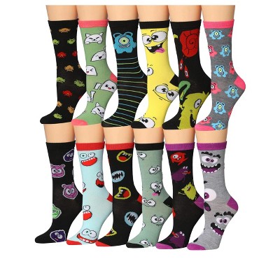 Tipi Toe Women's 12 Pairs Lightweight Colorful Cartoon Funny Eye Monster Face Patterned Crew Socks