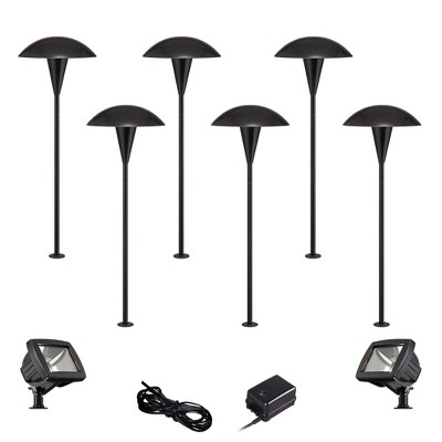 John Timberland Mushroom 18" High Mid Century Modern 8-Piece Outdoor Landscape Lighting Set Porch House LED Bulb Dusk To Dawn Black Metal Shade