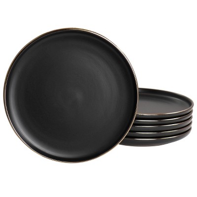 Elama 6pc Paul Stoneware Salad Plate Set with Rim Matte Black/Gold: Solid Round Black Plates, Dishwasher & Microwave Safe