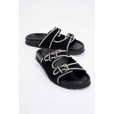 Allen - Black Leather Rhinestone Slide Sandal (Women) | Forever & Always Shoes