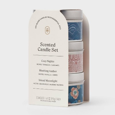 3pk Gift Set Cozy Nights, Blushing Amber, and Island Moonlight Tin Candle 12.3oz - Threshold™