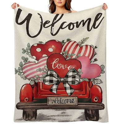 Valentine's Day Fleece Blanket Ultra Soft Anti-Pilling Red Truck Heart Welcome Print for Couch Bed Camping 30x40 inches