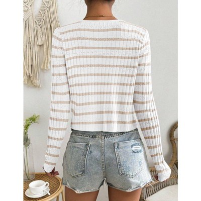 Womens Tie Front Stripe Cardigans Summer Long Sleeve Knit Shrug for Dress Sweaters Crop Tops