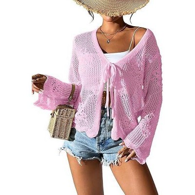 Cover Up Top for Bikni Swimsuits Bathing Suits Womens Cropped Beach Cover Up Tops Tie Front Crochet Cardigan Long Sleeve Open Front Shrug