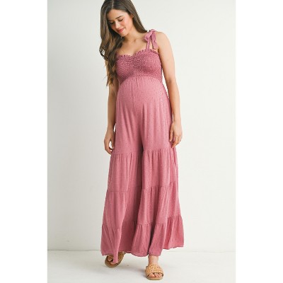 Hello Miz Women's Smocked Tie-Strap Swiss Dot Wide-Leg Maternity Jumpsuit