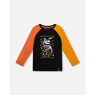 Deux par Deux Boy Black Long Sleeve Raglan T-Shirt with Glow-In-The-Dark Dinosaur Print - 3 Years