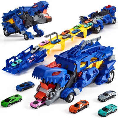 Large Dinosaur Transport Truck with 12 Dinosaur Cars & Foldable 3-Layer Race Track, Educational Kids Toy Birthday Christmas Gift for Boys Girls 3-8