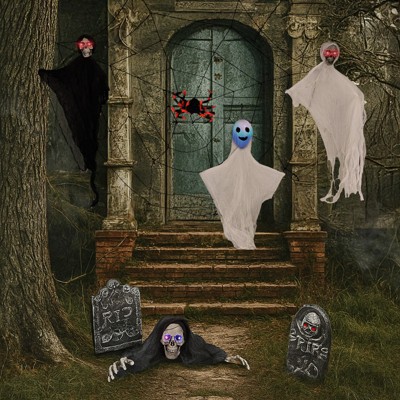 Outdoor Halloween Decorations 8-Piece Set, Hanging Ghosts Decor and Cobweb and Gravestone with Lighted Up Eyes, Scary Ghost Flying for Yard Patio