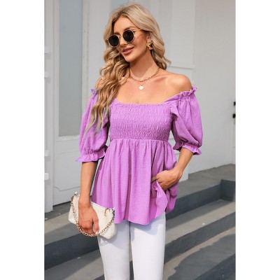 Women Square Neck Puff Short Sleeve Smocked Blouse, Off Shoulder Casual Peplum Tunic Top, Elegant Solid Color Summer Shirt For Daily Wear