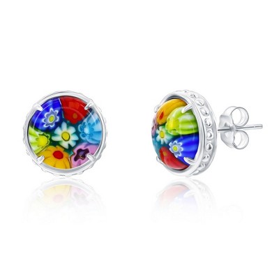 Millefiori di Murano Sterling Silver, Venetian Murano 12mm Round Earrings - Multi Color - Multi