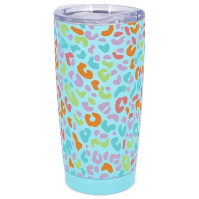 Elanze Designs 20 oz Stainless Steel On the Go Insulated Travel Tumbler With Push Top Lid, Rainbow Cheetah Leopard Print Sky Blue