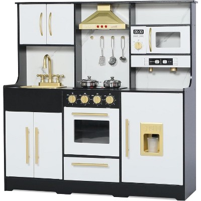 Costway Play Kitchen with Chalkboard Microwave Stove Dish Rack Faucet Sink Accessories White + Natural/Blue/Green + White