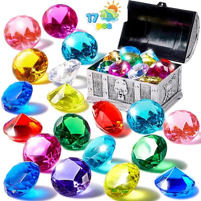 Joyfy 17 Pcs Diving Pool Toys, 16 Big Colorful Diamond Gems with Pirate Treasure Chest, Swimming Dive Toy for Kids Underwater Adventure Pool Games