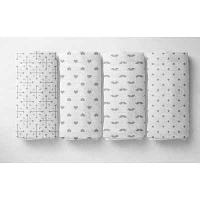 Bacati - LOVE Muslin Swaddling Blankets set of 4, Gray/White