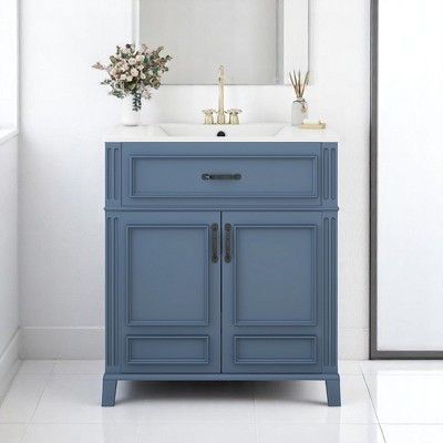 Mshliw 24 Inch Bathroom Vanity with Ceramic Sink, Freestanding Storage Cabinet with Door Shelf, Deep Drawer and Pull-Out Basket,Blue Grey