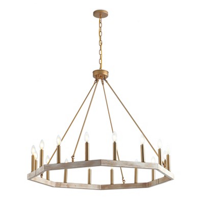 Dewdrop Modern Farmhouse 12-Light Chandelier, Wood & Gold Ring for Dining Room & Foyer