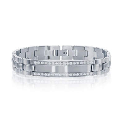 Metallo Mens Stainless Steel ID Engravable CZ Bracelet - Silver 8.5 Inch