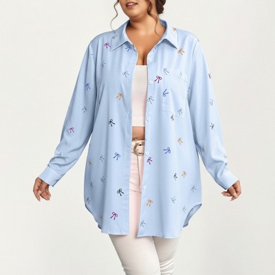 Anna-Kaci Women's Plus Size Bow Print Long Sleeve Button Down Shirt with Relaxed Fit and Soft Lightweight Fabric