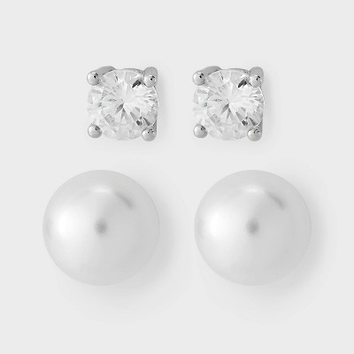Silver Plated Glass Pearl Cubic Zirconia Round Stud Post Earring Set 2pc - A New Day™