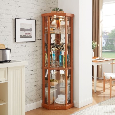 Gulches Lighted Corner Curio Cabinet Light Oak Glass Display Case with Adjustable Shelves & Anti-Toppling Device, Storage for Living Room