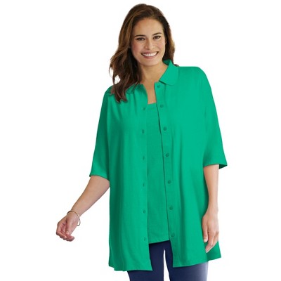 Catherines Anywear Pucker Cotton Buttonfront Roll Tab Shirt
