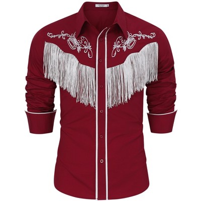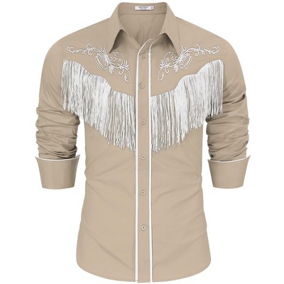Men's Cowboy Costume Western Long Sleeve Casual Fringe Hippie Slim Fit Button Down Shirt